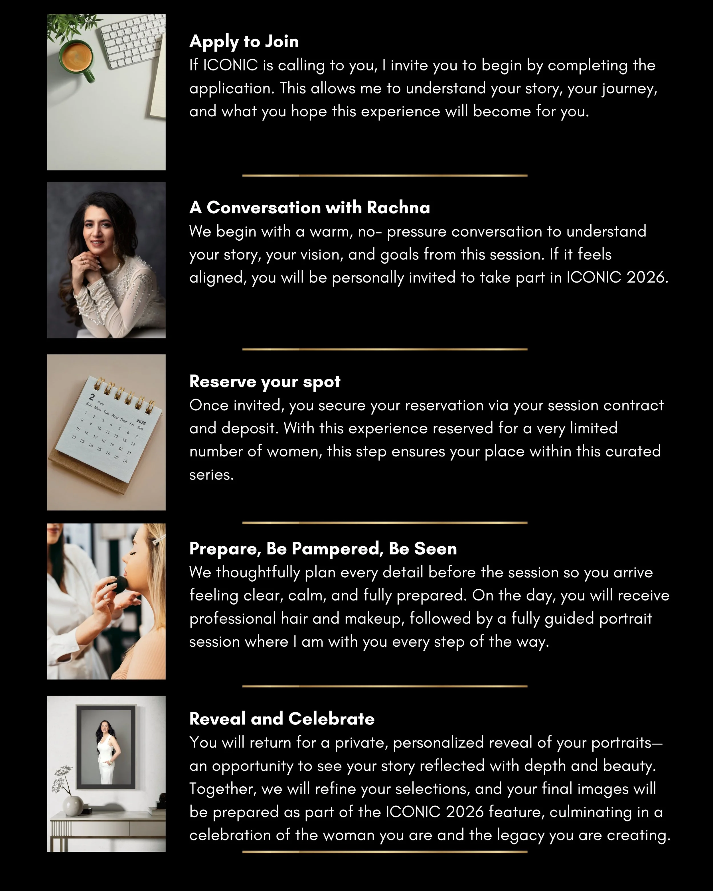 From there, every detail is thoughtfully guided. From styling and preparation to a calm, fully directed portrait session. You will return for your private reveal, where you will select the portrait that will represent your story in the ICONIC 2026 magazine.